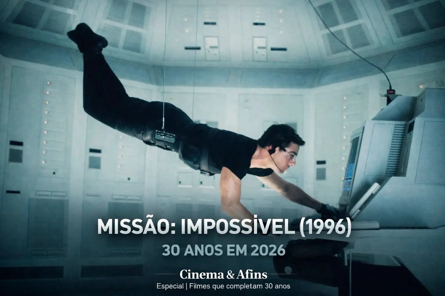 Tom Cruise na icônica cena suspensa por cabos em Missão Impossível 1996, filme de espionagem que completa 30 anos em 2026