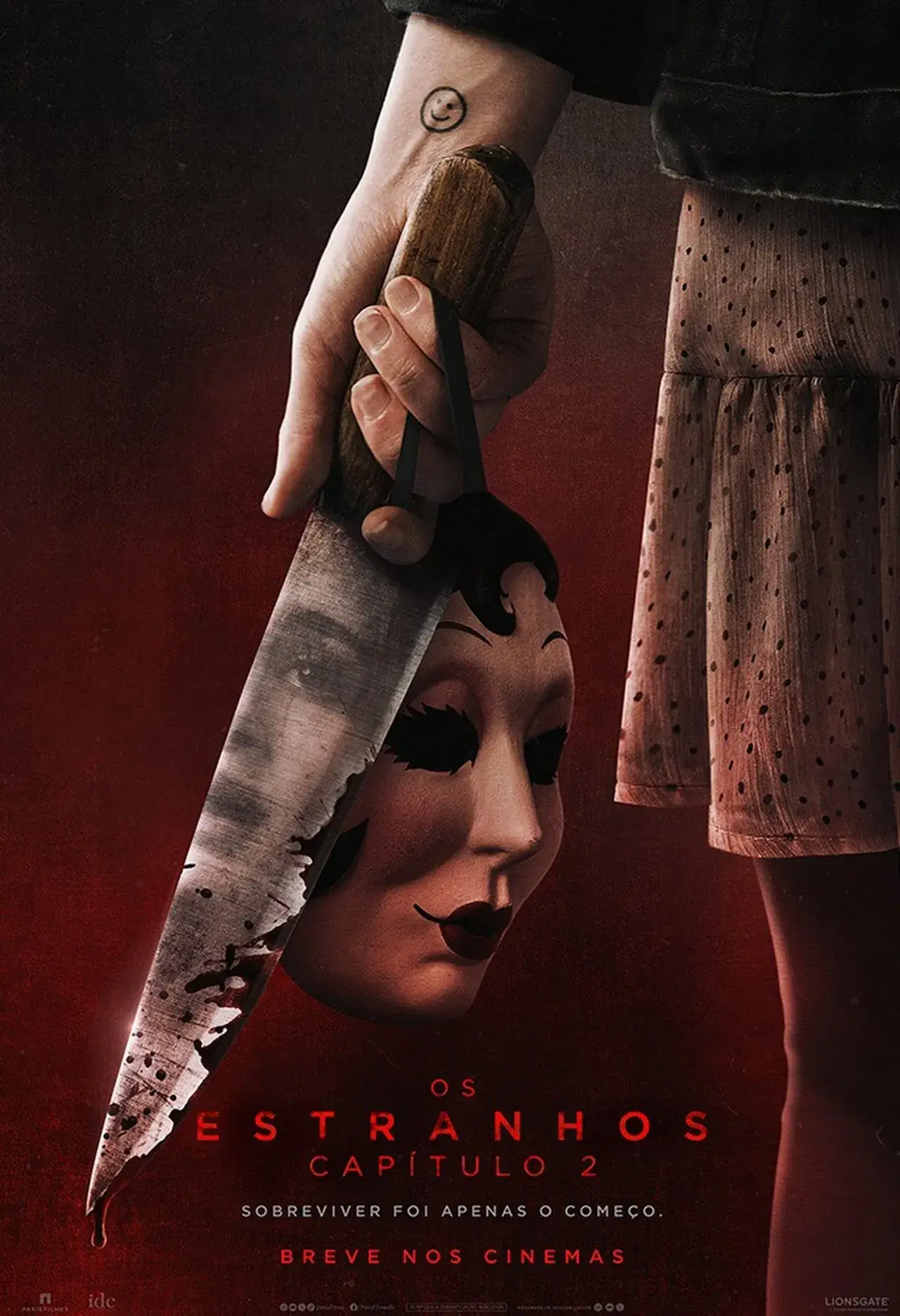 Pôster oficial do filme Os Estranhos: Capítulo 2 (2025), mostrando uma máscara ensanguentada e uma faca.