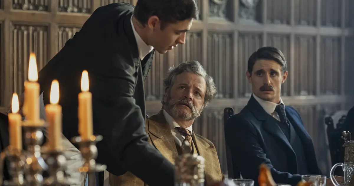 Colin Firth, Max Irons e Hero Fiennes Tiffin em uma das cenas da série, representando o elenco de Jovem Sherlock (2026), produção do Prime Video.